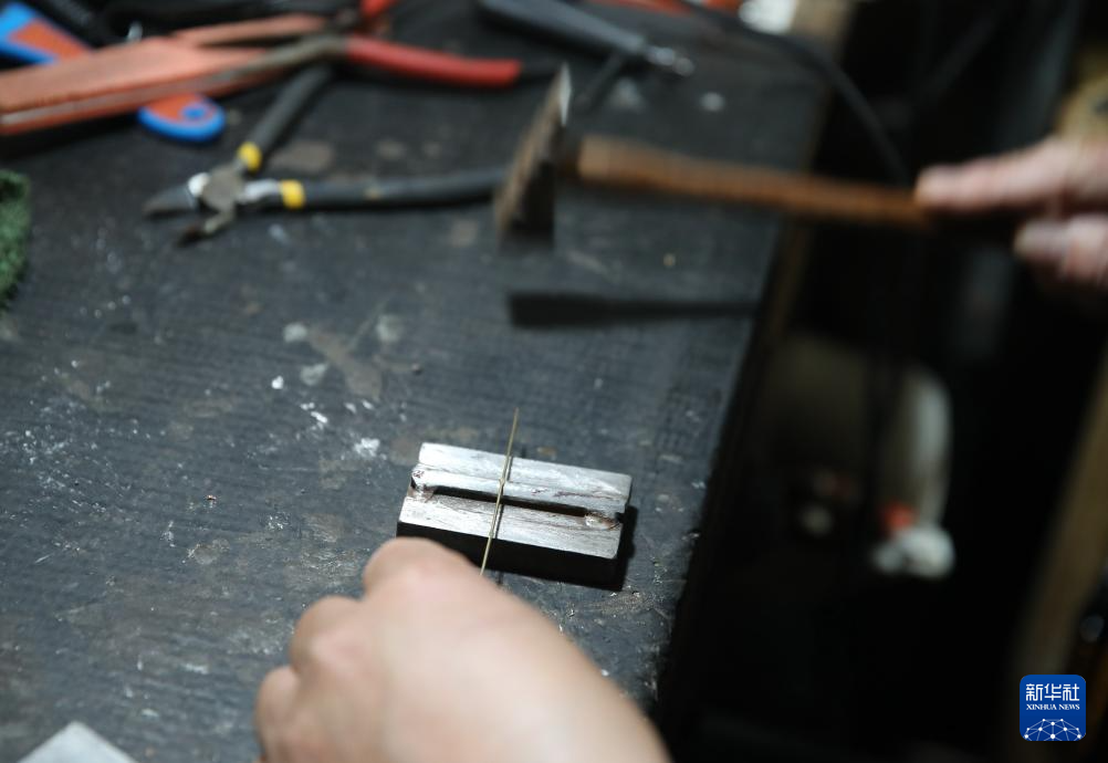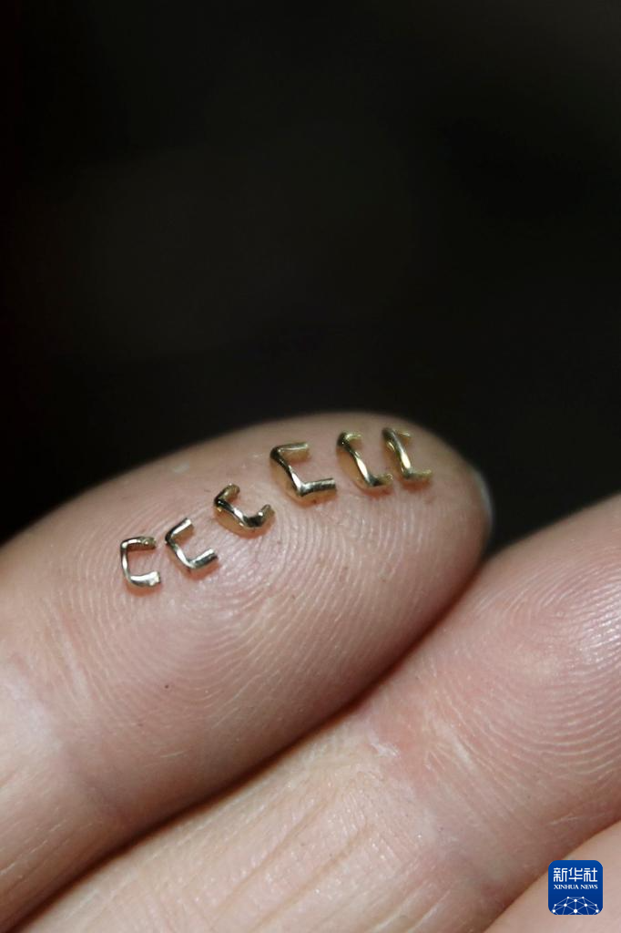 楊濤展示手工制作的金屬鋦釘(5月8日攝)。