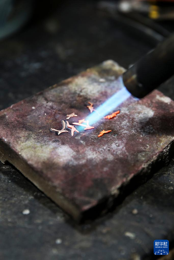 楊濤在工作室制作鋦瓷用的花釘(5月8日攝)。