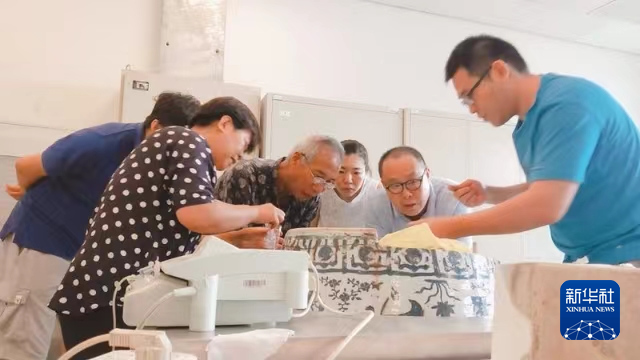 楊濤(右二)在首都博物館參加明嘉靖青花魚藻紋殘損大缸修復工作(2018年攝,受訪者供圖)。