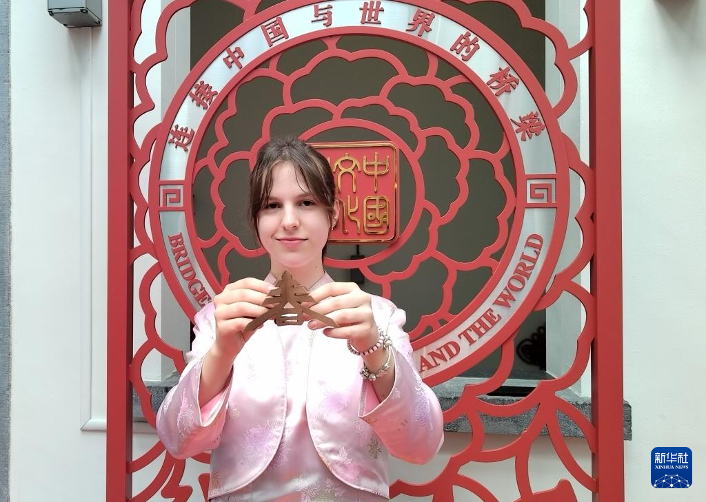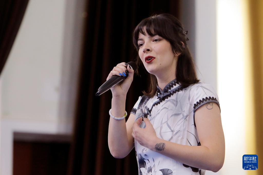 這是5月26日在布加勒斯特舉行的第23屆“漢語橋”世界大學生中文比賽羅馬尼亞賽區決賽中拍攝的特等獎獲得者伊萬娜·米哈伊。