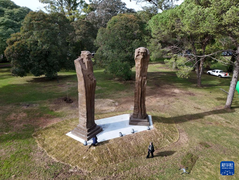 這是5月29日在烏拉圭首都蒙得維的亞市中心的巴特列公園拍攝的雕塑作品《問道》(無人機照片)。