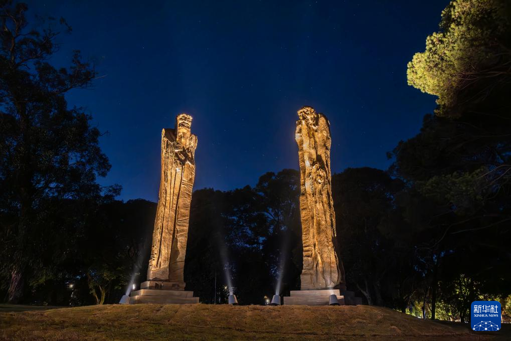 這是5月28日在烏拉圭首都蒙得維的亞市中心的巴特列公園拍攝的雕塑作品《問道》。新華社發(陳曦攝)