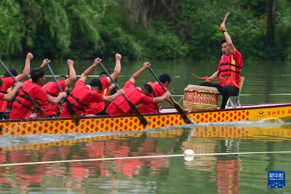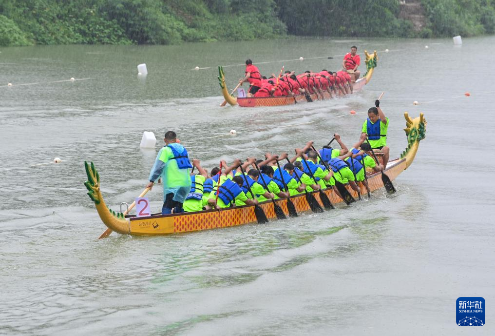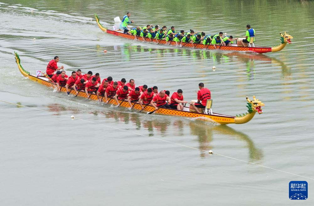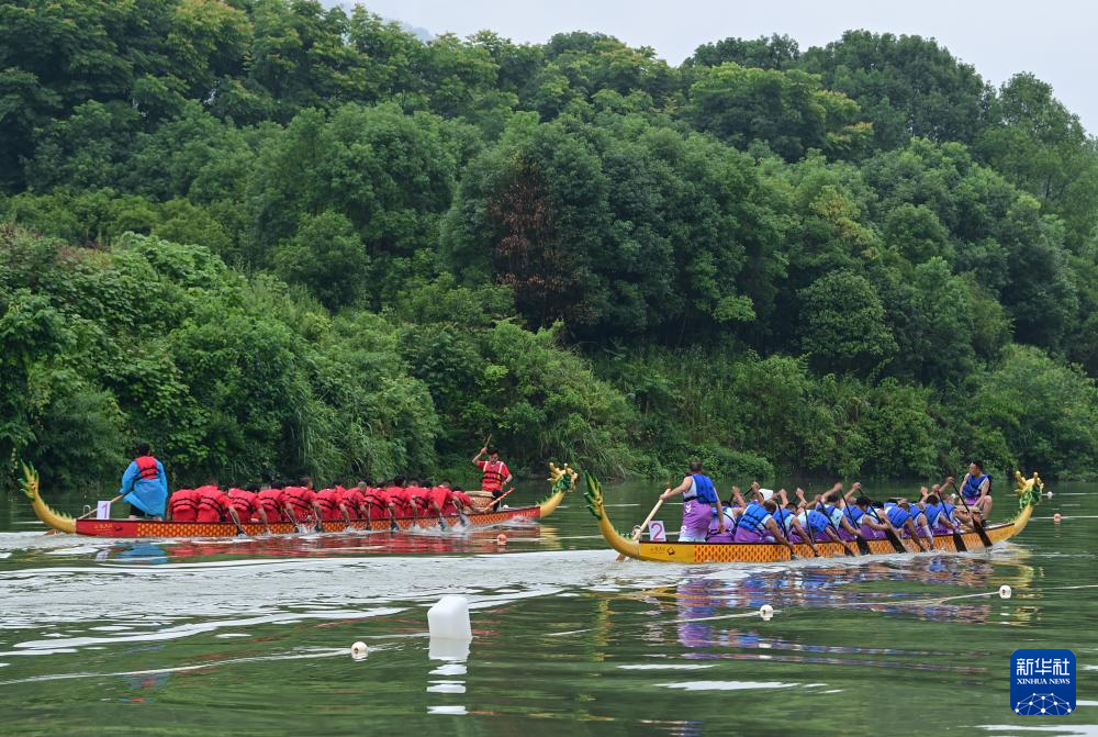 5月29日,在酉陽縣龍潭鎮,龍舟隊在水面角逐。