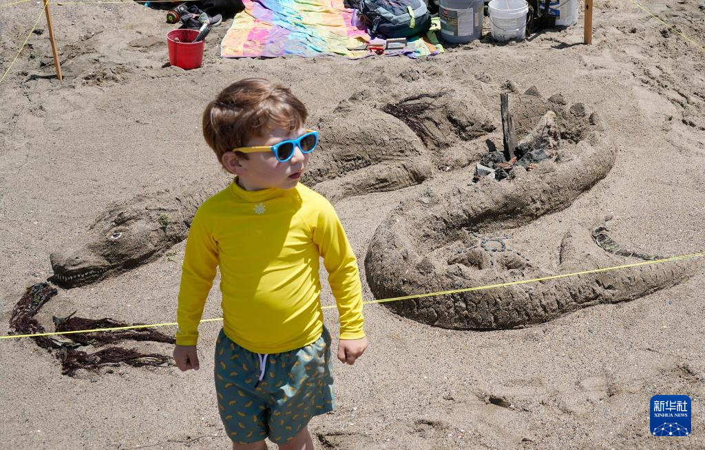 6月1日,一名男孩站在美國加利福尼亞州阿拉米達縣的一處沙雕作品前。