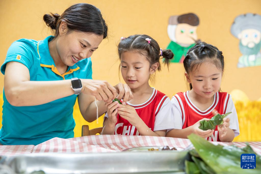 6月3日,河南省商丘市睢縣古襄路幼兒園小朋友在老師的指導下學習包粽子。