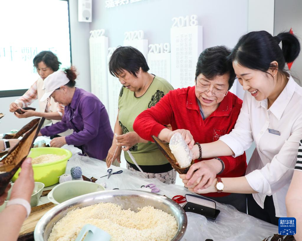 6月4日,浙江省舟山市定海區環南街道南珍社區的居民聚在一起包粽子。