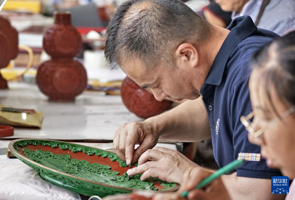 朱江在他的雕漆工作室進行雕漆創作(5月30日攝)。