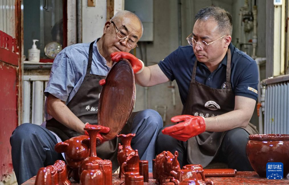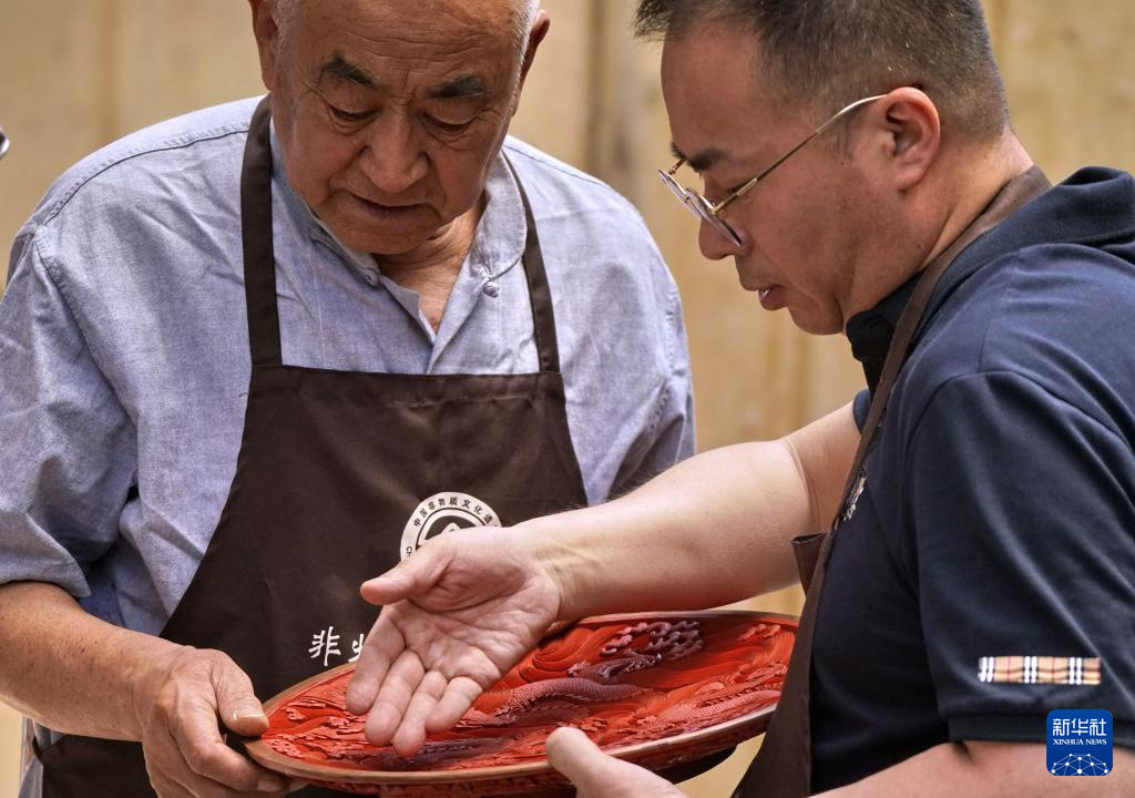 朱江(右)和父親朱慶元在雕漆工作室研究髹漆過程中的問題(5月30日攝)。