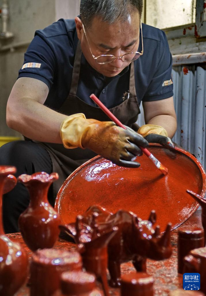 朱江在雕漆工作室對木胎盤子進行反復髹漆(5月30日攝)。