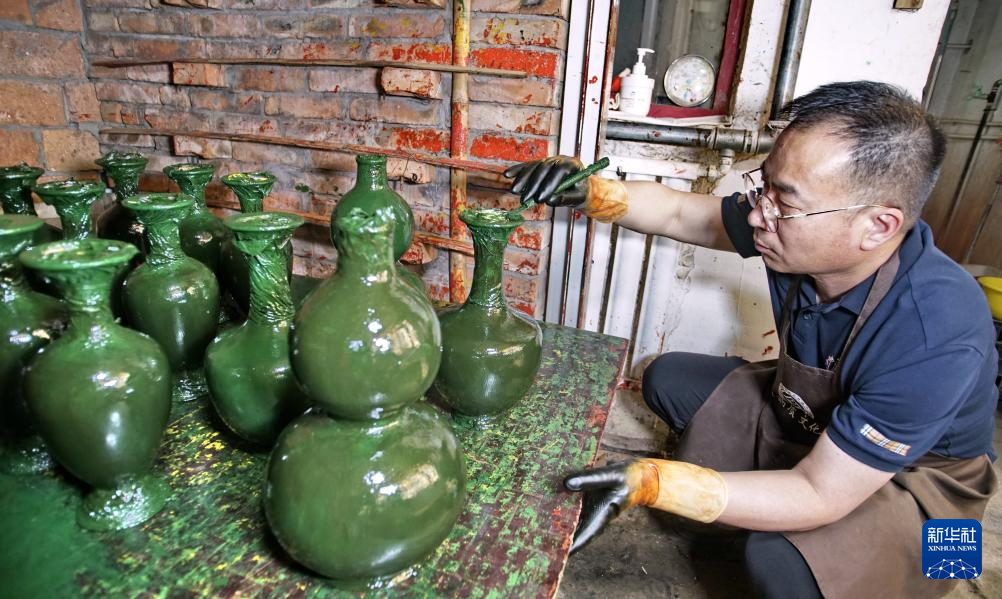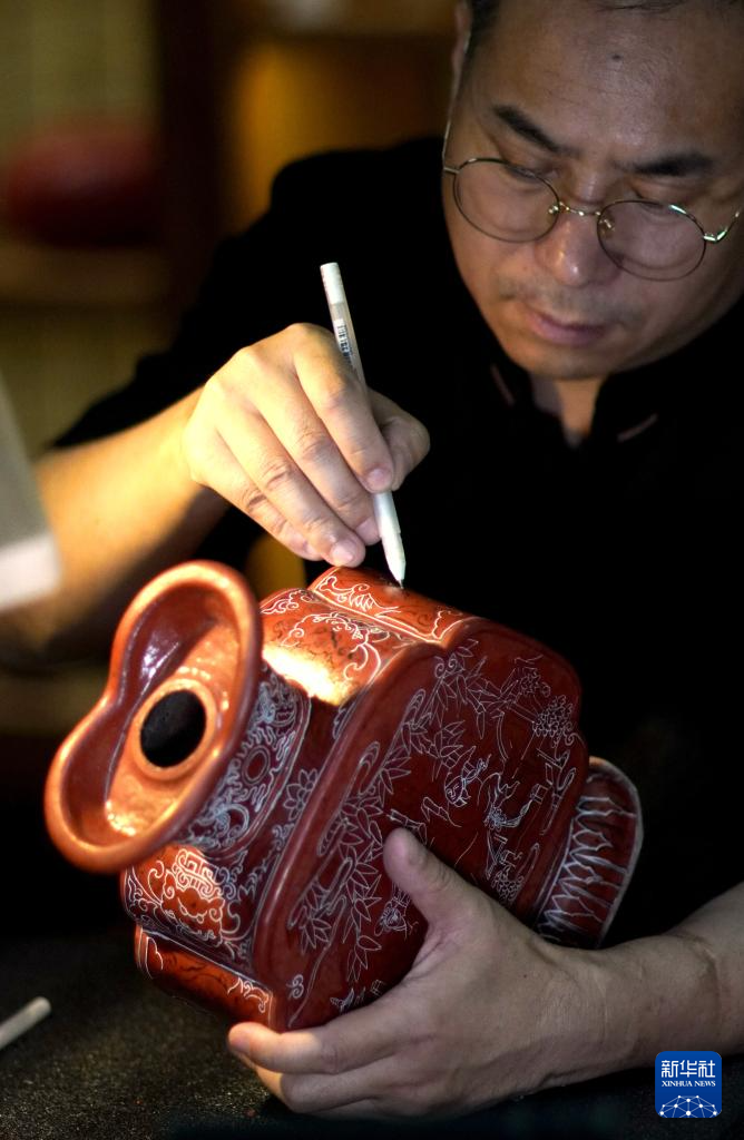 朱江在工作室為髹漆后的胎體繪制線稿(6月5日攝)。