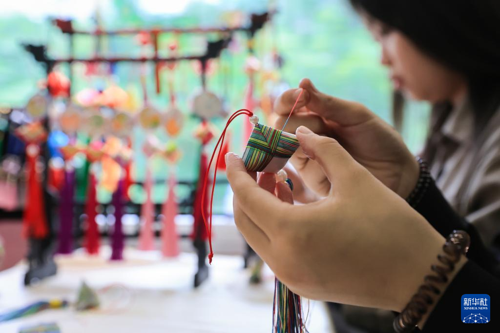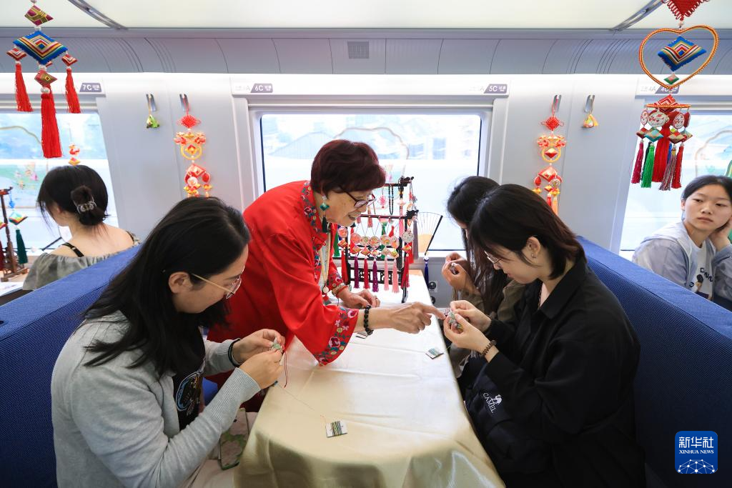 6月5日,在G7393次列車上,旅客在民間藝人的指導下體驗制作端午彩粽。