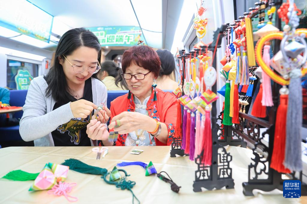 6月5日,在G7393次列車上,旅客(左)在民間藝人的指導下體驗制作端午彩粽。