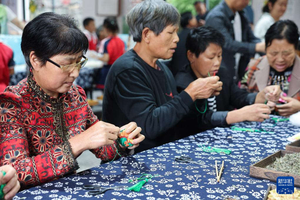 6月5日,老人在東白湖鎮東白山村文化禮堂體驗制作端午香囊。