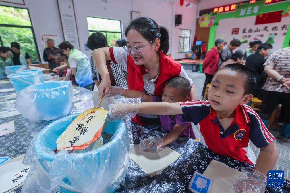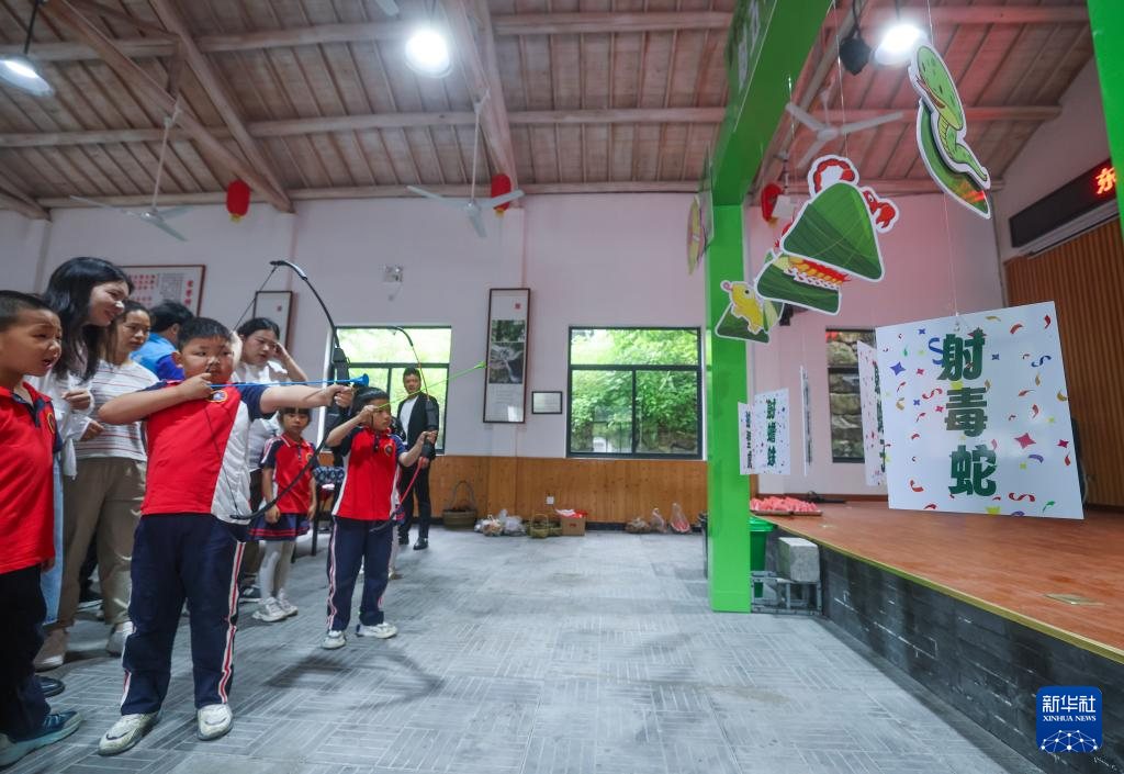6月5日,孩子們在東白湖鎮東白山村文化禮堂參加“射五毒”游戲。