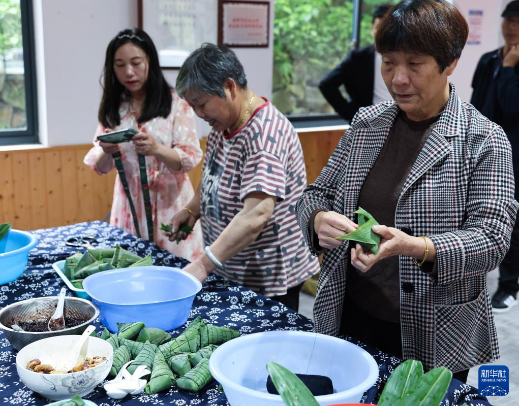 6月5日,老人在東白湖鎮東白山村文化禮堂包粽子。