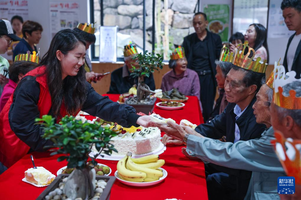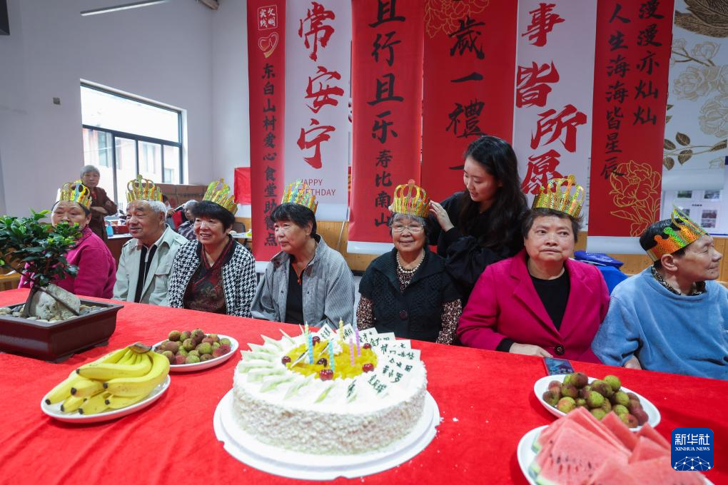6月5日,老人在東白山村文化禮堂內參加集體生日宴,志愿者為老人送上生日蛋糕。