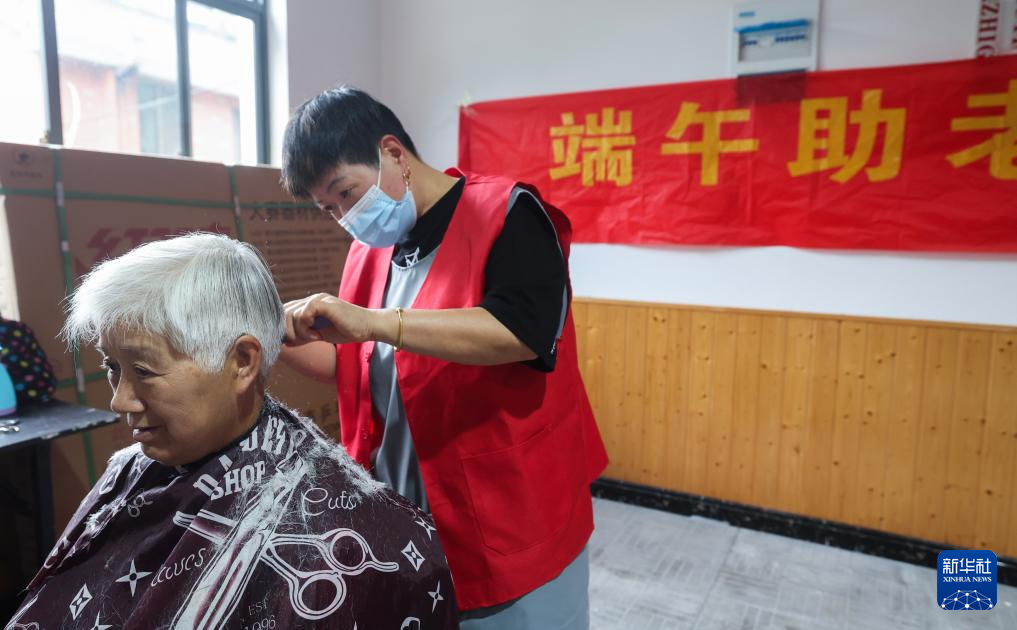 6月5日,志愿者在東白湖鎮東白山村文化禮堂給老人義務理發。