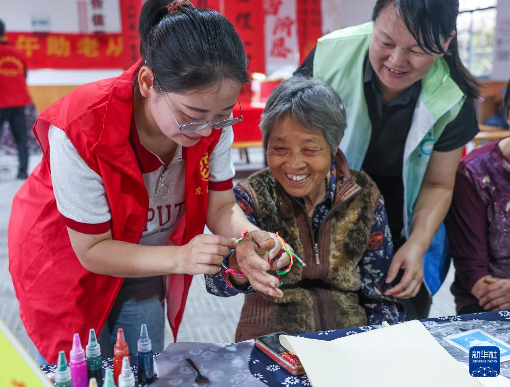 6月5日,志愿者在東白湖鎮東白山村文化禮堂給老人戴上端午五彩繩。