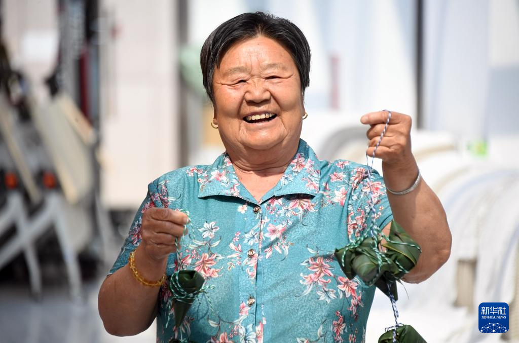 6月6日,在北京市平谷區平谷鎮仁和社區居委會,社區居民展示在“粽葉飄香·情滿社區”活動中包的粽子。