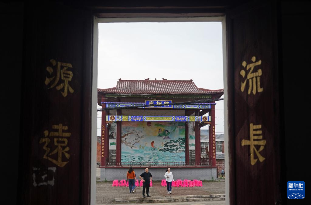 在廣昌縣頭陂鎮西港村,工作人員為晚上的孟戲演出做準備(5月10日攝)。