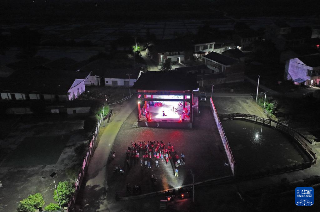 在廣昌縣頭陂鎮西港村,村民在觀看孟戲演出(5月10日攝,無人機照片)。