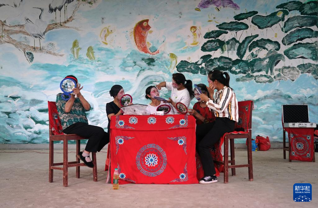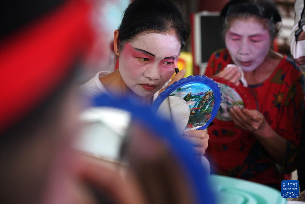 在廣昌縣頭陂鎮西港村,劇團團員在演出前化裝(5月10日攝)。