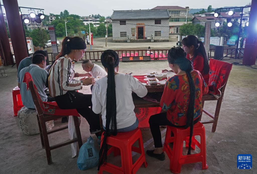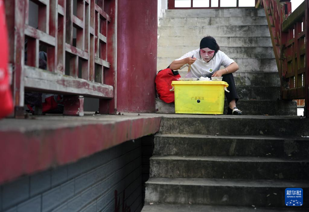 在廣昌縣頭陂鎮西港村,劇團團員在演出前吃飯(5月10日攝)。