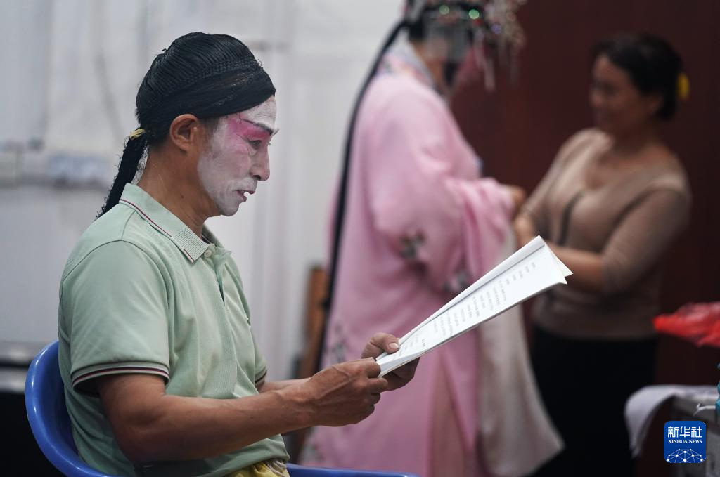 在位于廣昌縣甘竹鎮的大路背孟戲劇團后臺,李安平(左一)翻看劇本(5月11日攝)。