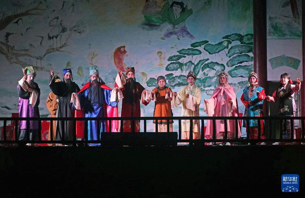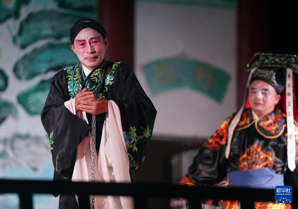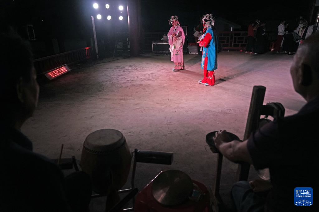 在廣昌縣頭陂鎮西港村,劇團演員為村民演出孟戲選段《送別》(5月10日攝)。