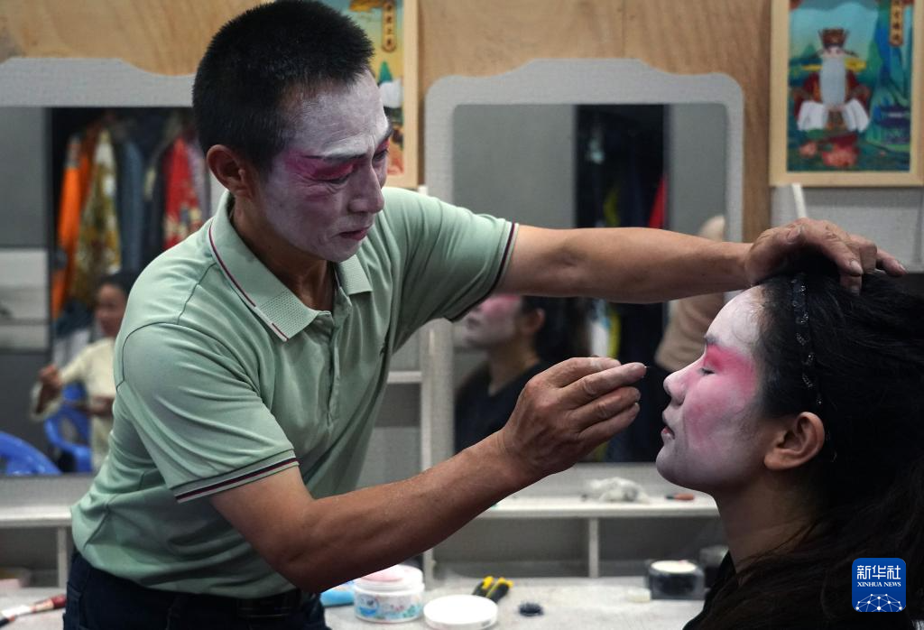 在廣昌縣甘竹鎮的大路背孟戲劇團,李安平(左)在給戲曲愛好者化裝(5月11日攝)。