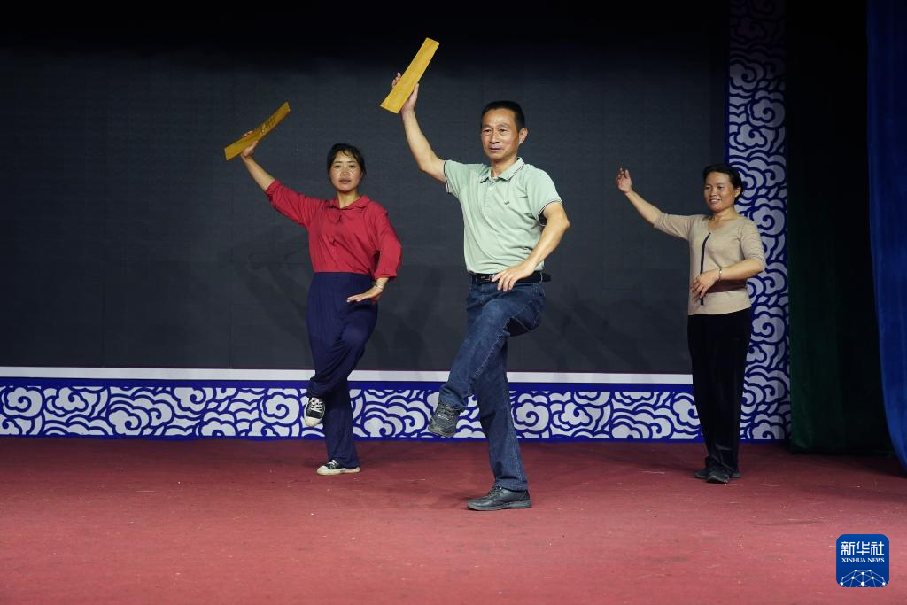 在廣昌縣甘竹鎮的大路背孟戲劇團,李安平和團員一起排練(5月11日攝)。