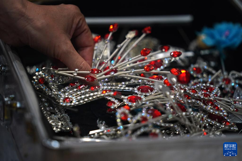 在廣昌縣甘竹鎮的大路背孟戲劇團后臺,演員化裝時選用孟戲頭飾(5月11日攝)。