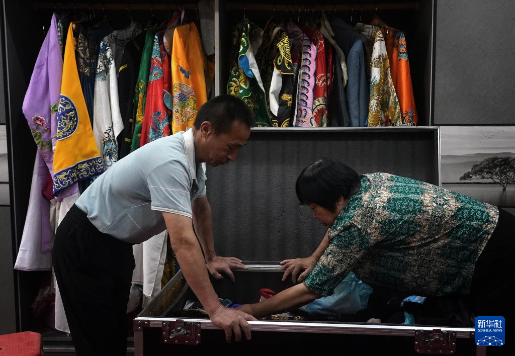 李安平(左)在整理戲服,準備前往廣昌縣頭陂鎮西港村演出(5月10日攝)。