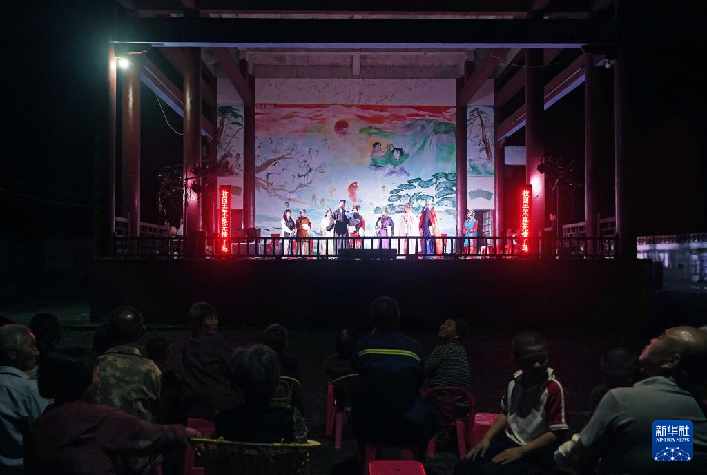 在廣昌縣頭陂鎮西港村,村民在觀看孟戲演出(5月10日攝)。