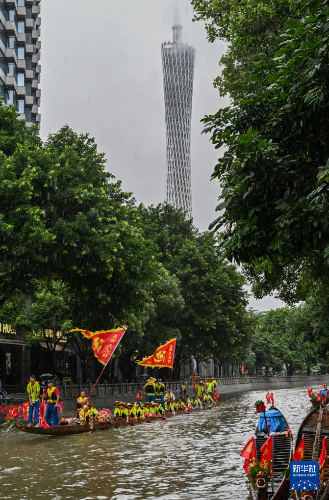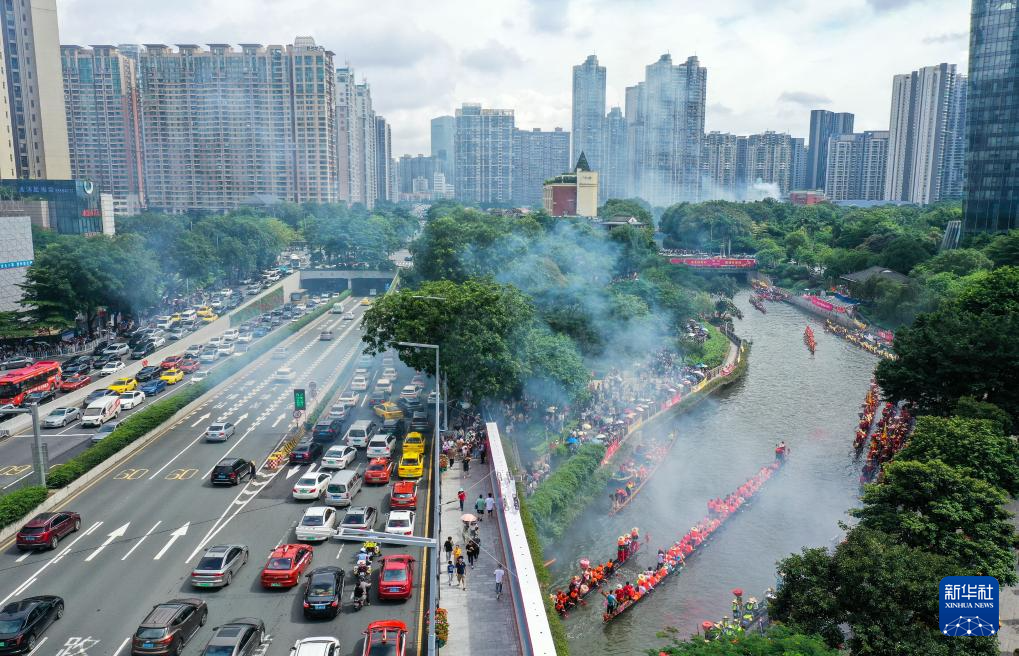 6月10日,獵德村熱鬧的傳統龍舟“龍船景”與繁忙的現代都市交匯相融(無人機照片)?!褒埓啊笔菑V府地區水鄉在端午期間舉辦的一種民俗活動。