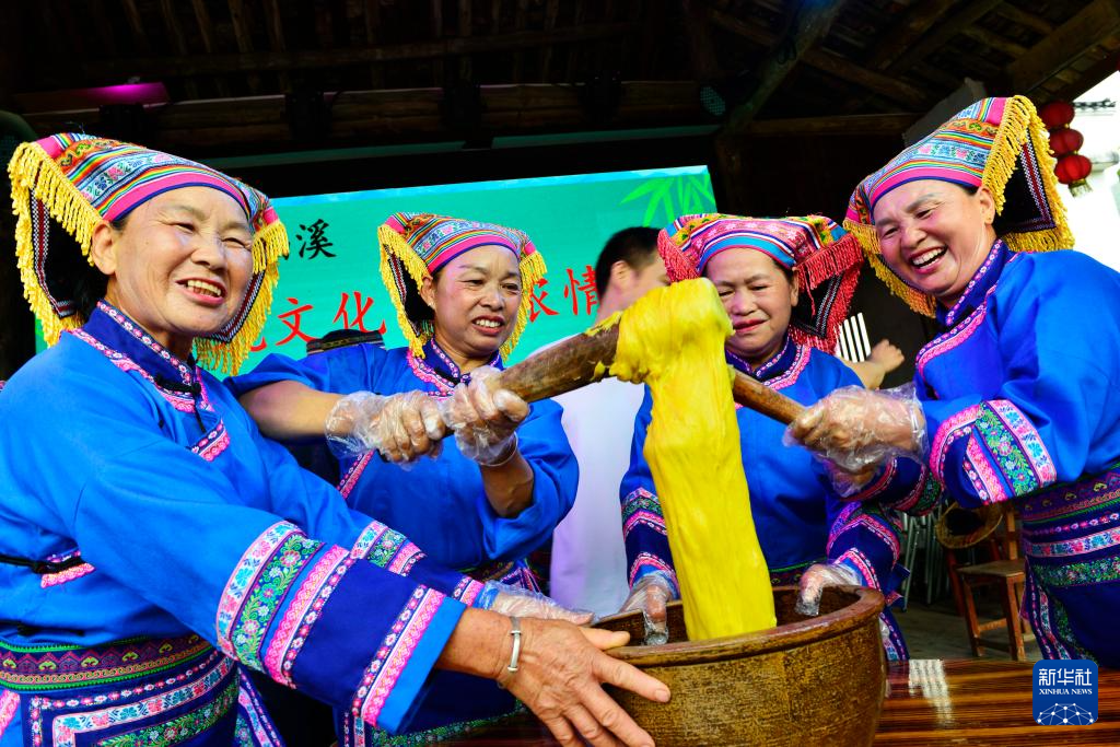 6月10日,在廣西富川瑤族自治縣朝東鎮福溪村,身穿瑤族盛裝的村民進行民俗活動打“凍糍”。