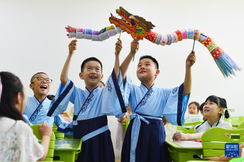 6月10日,兩名學生在山東省青島市市北區杭州路小學開展的端午文化活動上表演舞龍。