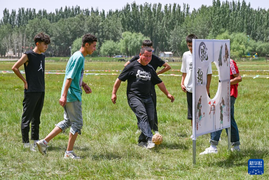 6月10日,在新疆阿克蘇地區拜城縣康其濕地公園,群眾體驗傳統蹴鞠。
