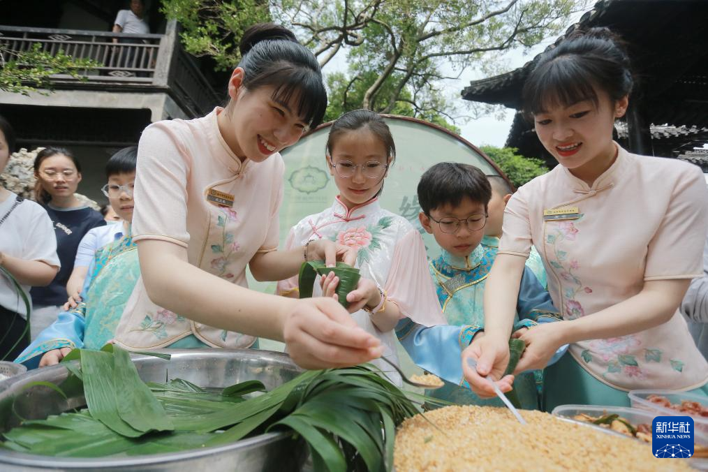 6月10日,在江蘇省揚州市何園景區,小朋友們和工作人員一起包粽子。