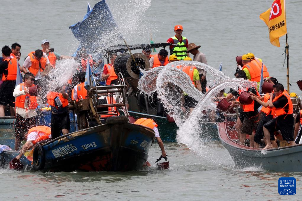 6月10日,第十八屆閩臺對渡文化節暨蚶江海上潑水節活動在福建省石獅市蚶江鎮開幕。這是游客在文化節上體驗海上潑水。