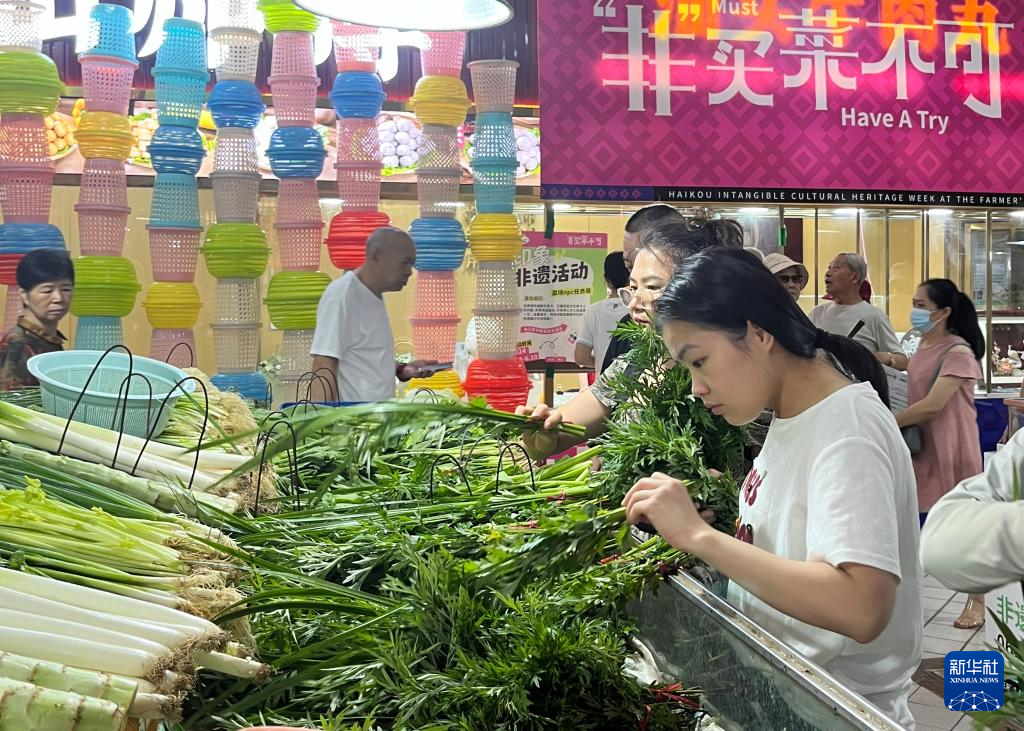 6月10日,市民在??谑形娜A菜市場舉辦的菜市場非遺生活周活動上選購艾葉。