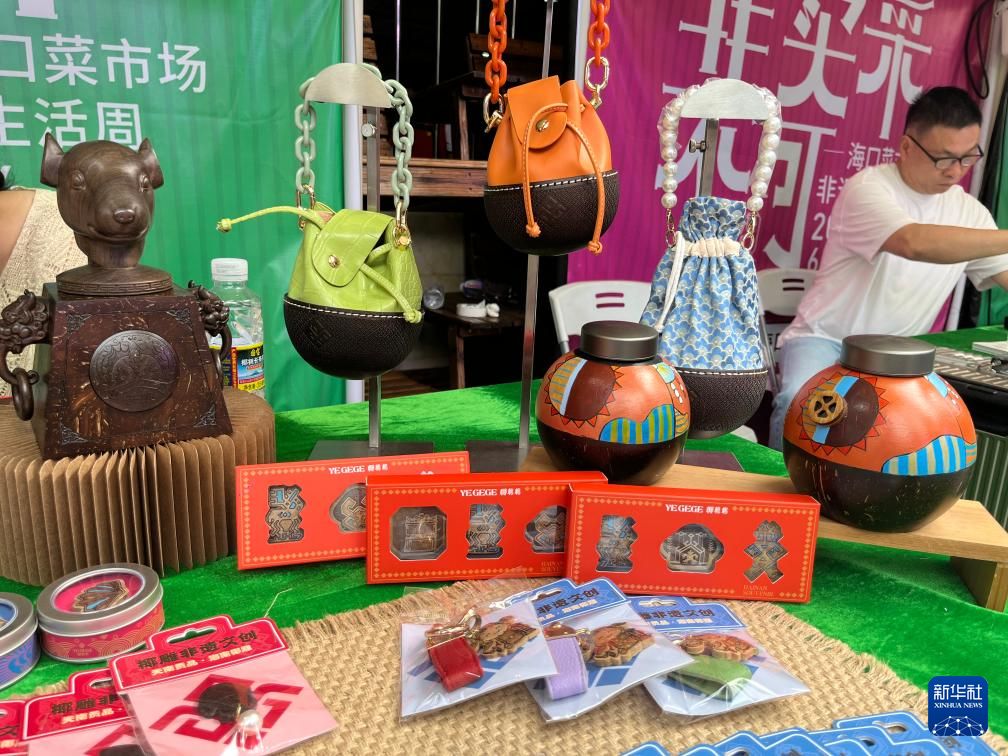 6月10日在??谑形娜A菜市場舉辦的菜市場非遺生活周活動上拍攝的椰雕工藝品。