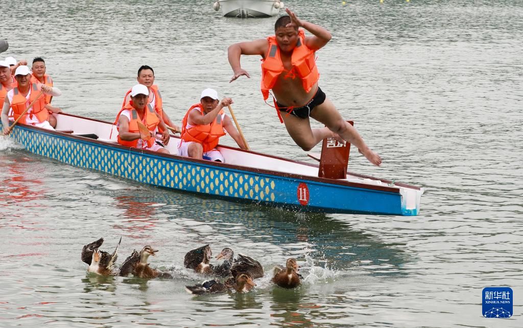 6月10日,四川省廣安市武勝縣龍舟隊員參加趣味搶鴨活動。