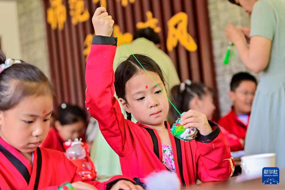 6月10日,小朋友在山東省青州市范公亭公園非遺傳習講堂開展的體驗活動中縫制香囊。