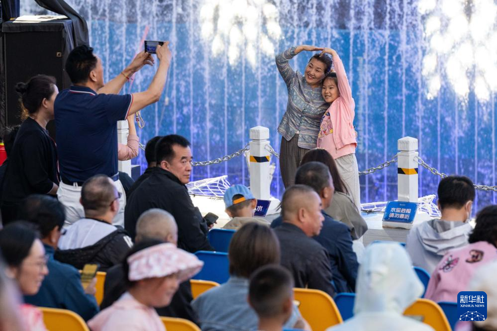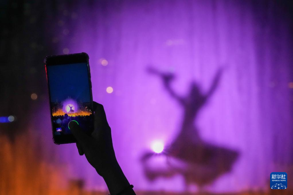 6月10日,觀眾在用手機拍攝《遇見·哈爾濱》演出現場的水幕舞臺效果。