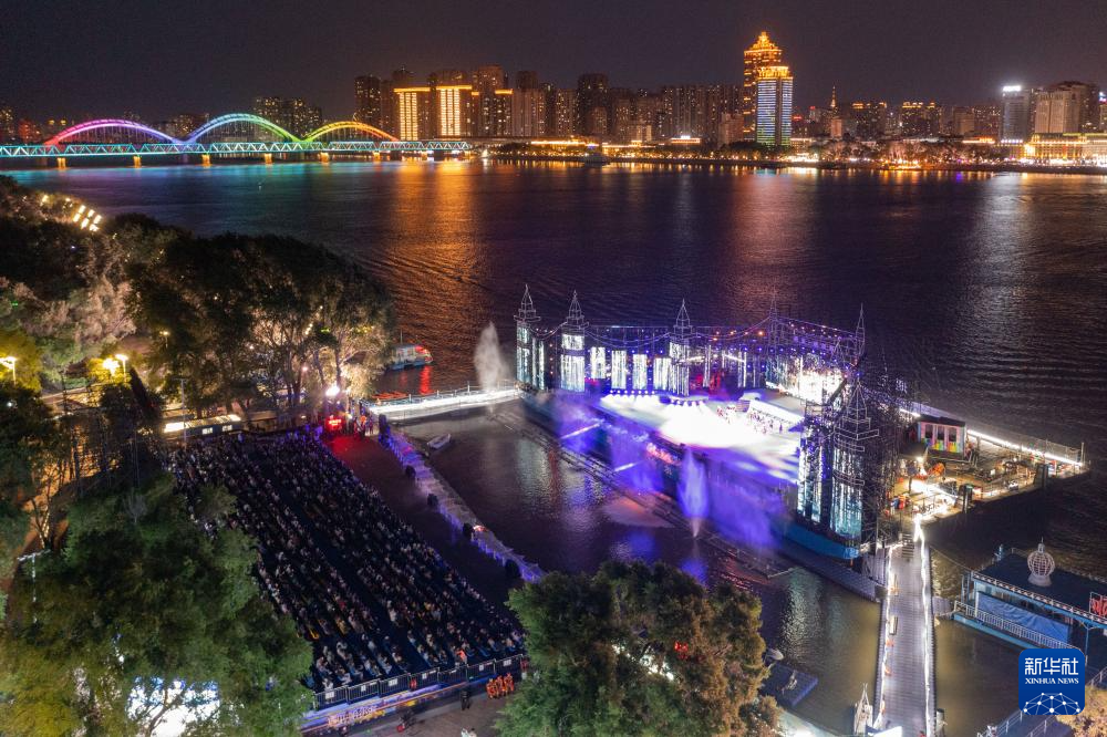 6月10日,觀眾在松花江畔觀看《遇見·哈爾濱》演出(無人機照片)。