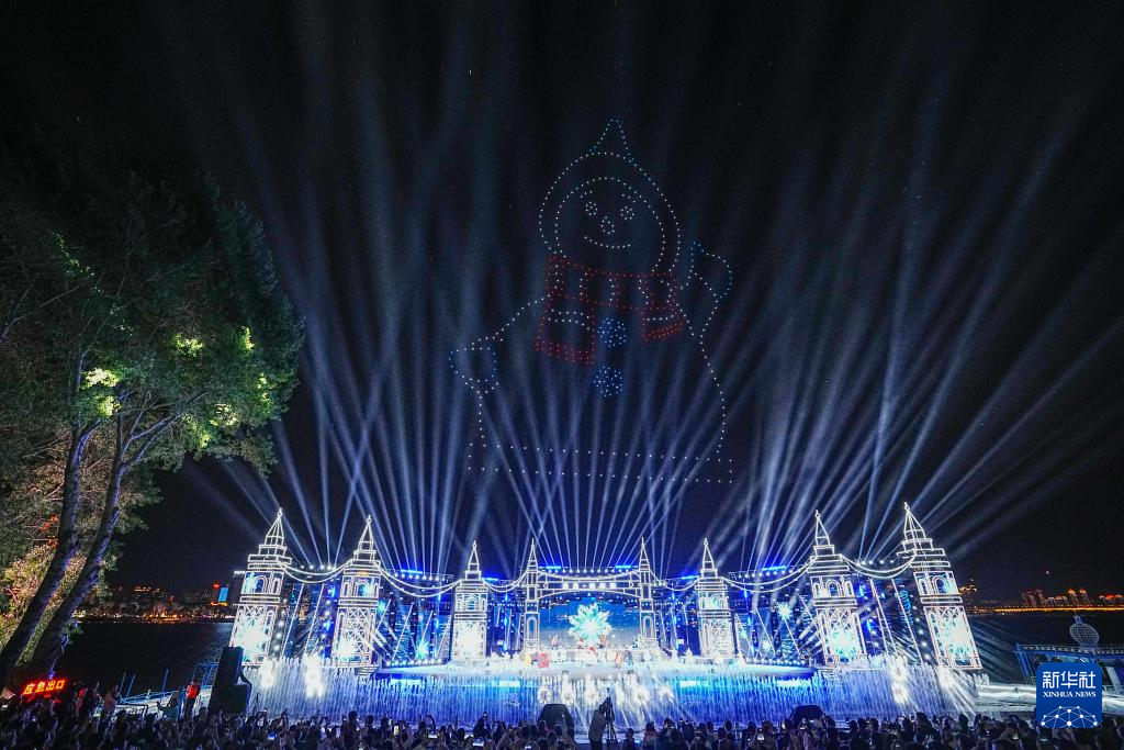 6月10日,觀眾在觀看《遇見·哈爾濱》演出現場上空的無人機表演。