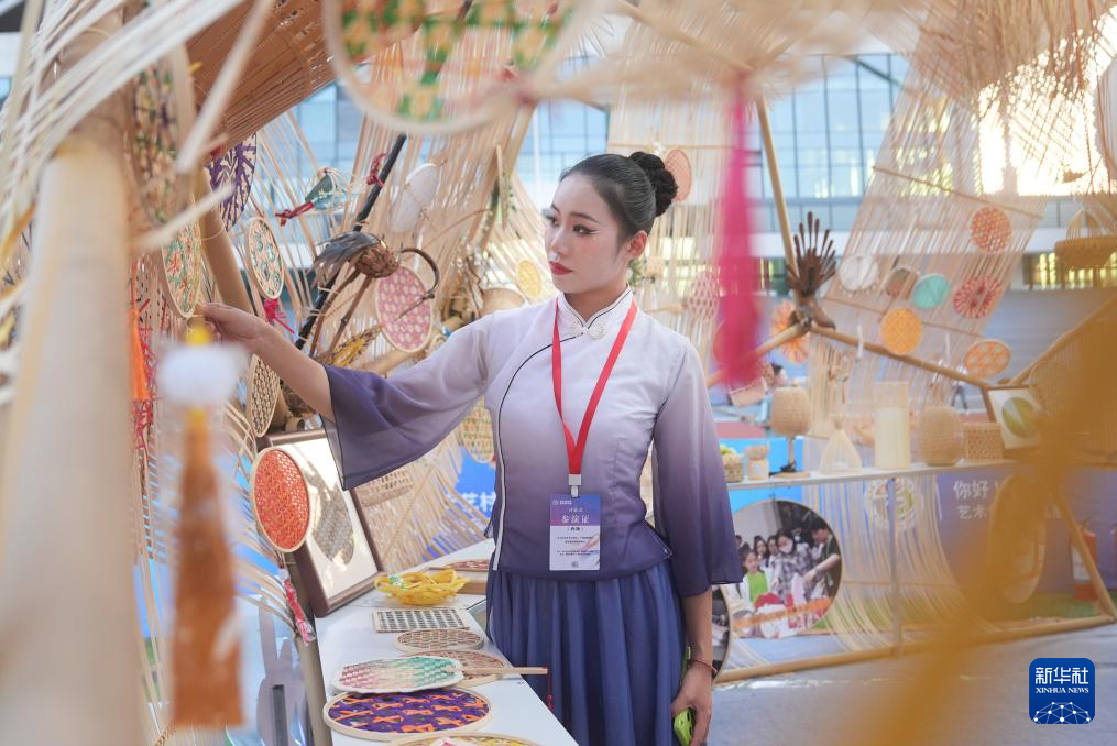 6月12日,參演學生參觀湖北科技學院展出的竹編工藝品。