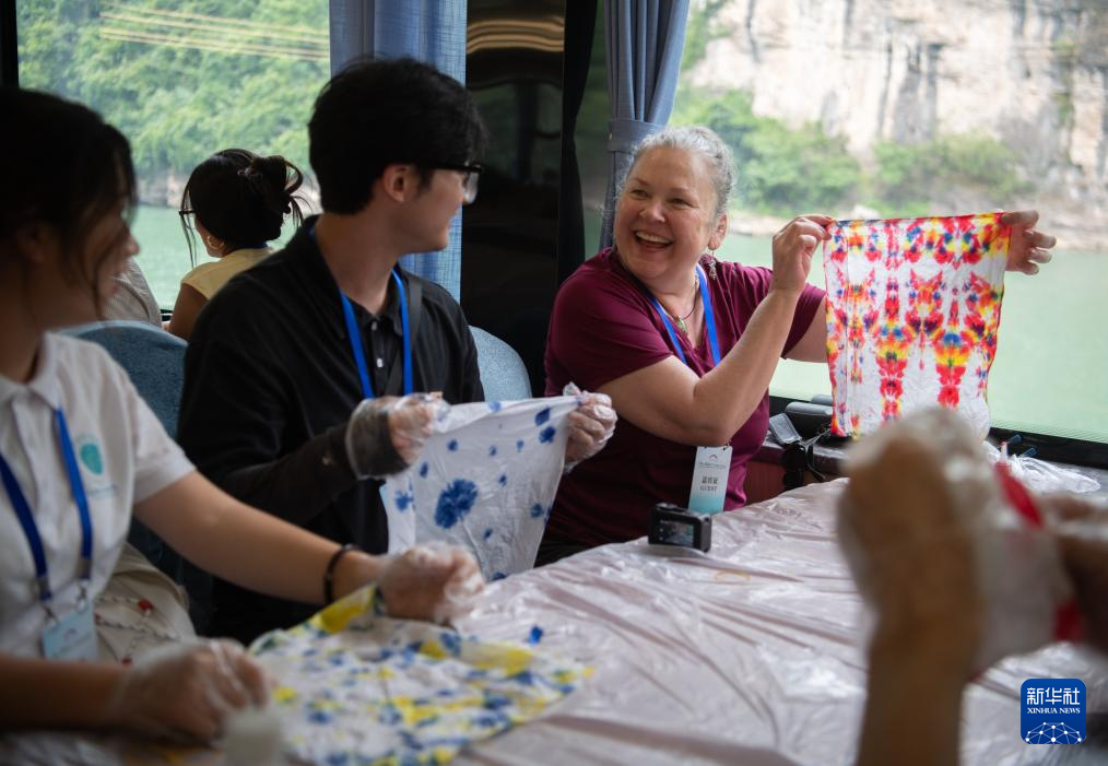 6月11日,在湖北省宜昌市,交流活動成員在純電動旅游船“長江三峽1”號上體驗扎染。