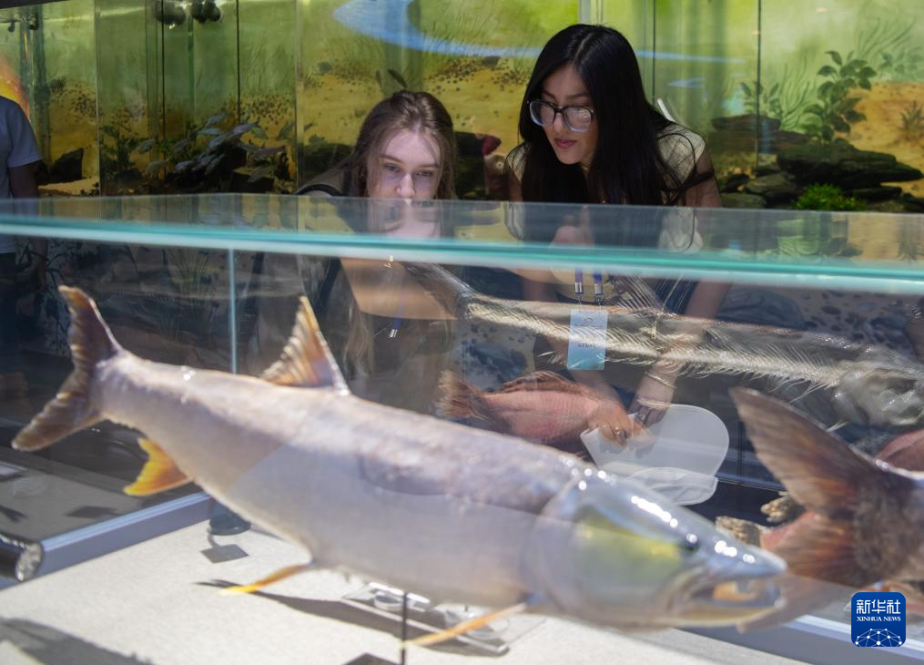 6月11日,在湖北省宜昌市,美國青年在三峽集團長江珍稀魚類保育中心參觀。